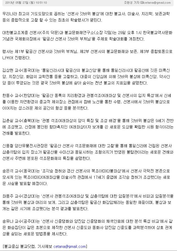 우리나라 최고의 기도도량으로 꼽히는 ‘선본사 갓바위 불상’에 대한 불교사, 미술사, 지리학, 보존과학 등의 종합적으로 고찰 할 수 있는 최초의 학술행사가 열린다.